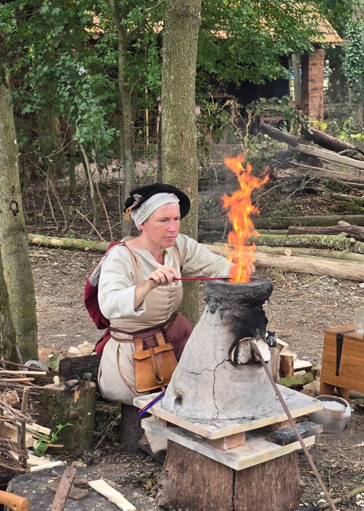 June 2025 – Tudor Midsummer at Kentwell Hall. Provide first person living history, mostly in the glassworks recreating historical beadmaking and glassblowing, but also playing for a handfasting that took place one of the days.